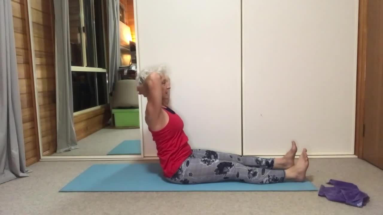 Lift the elbows lightly off the mat, bring them into your peripheral vision, and begin to roll up. Make sure as you nod your head not to over-flex your neck - keep lightly pressing your skull back into your hands and use your trunk strength to roll up. (if you’re using the arm modification, bring them behind your head when you can, usually just after the ‘icky bit’ part of your rolling up)