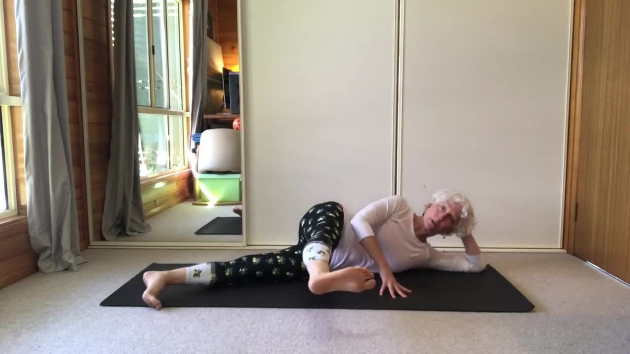 Next I'll move onto lying down all the way flat (extending the bottom arm straight out up above our head, top arm still on the mat in front of our breastbone) with the legs no longer in front of our hips but directly below them and carry on with the choreography...