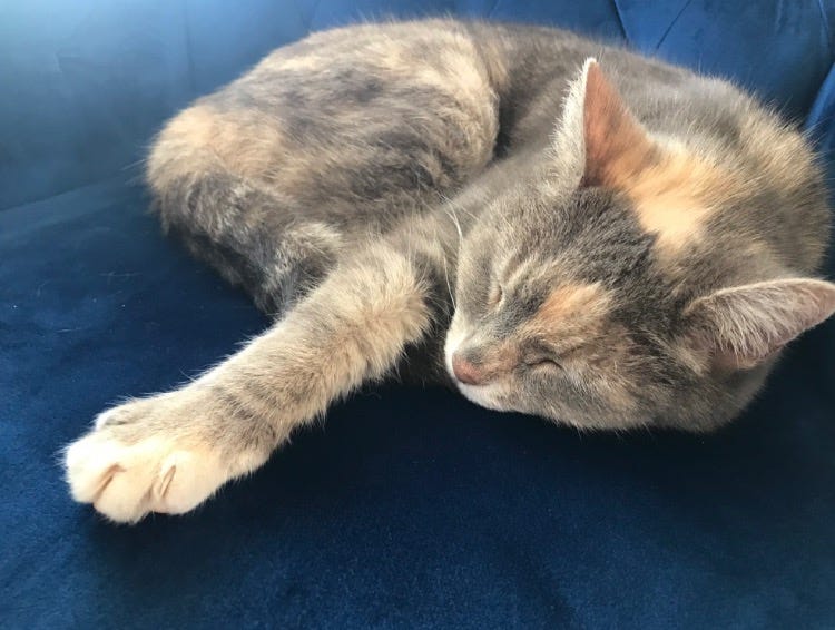 Every night when I climb into bed, my cat Tish joins me and plants herself in the teeny space between the edge of the bed and me (truthfully I have no idea how she manages to not fall off)! I usually give her some love, get some purrs in return and blissfully drift off to la la land.